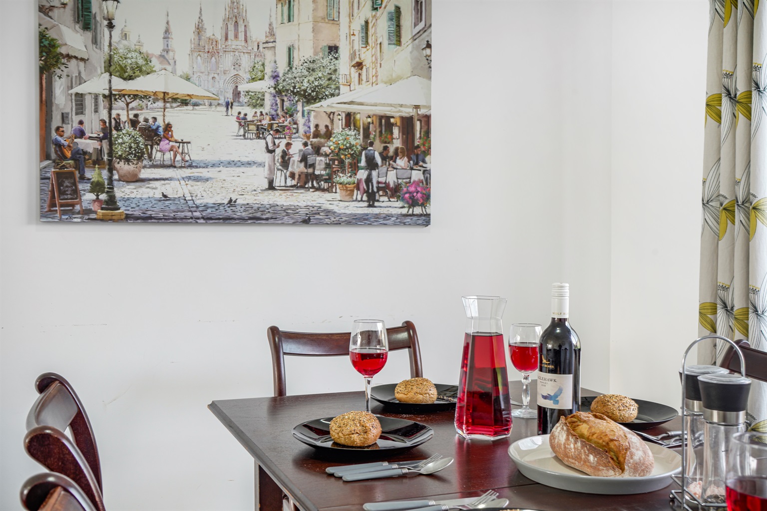 Open-Plan Living Area: Three sofas (two couches and one sofa bed), dining table for six, and a large flat-screen TV.
