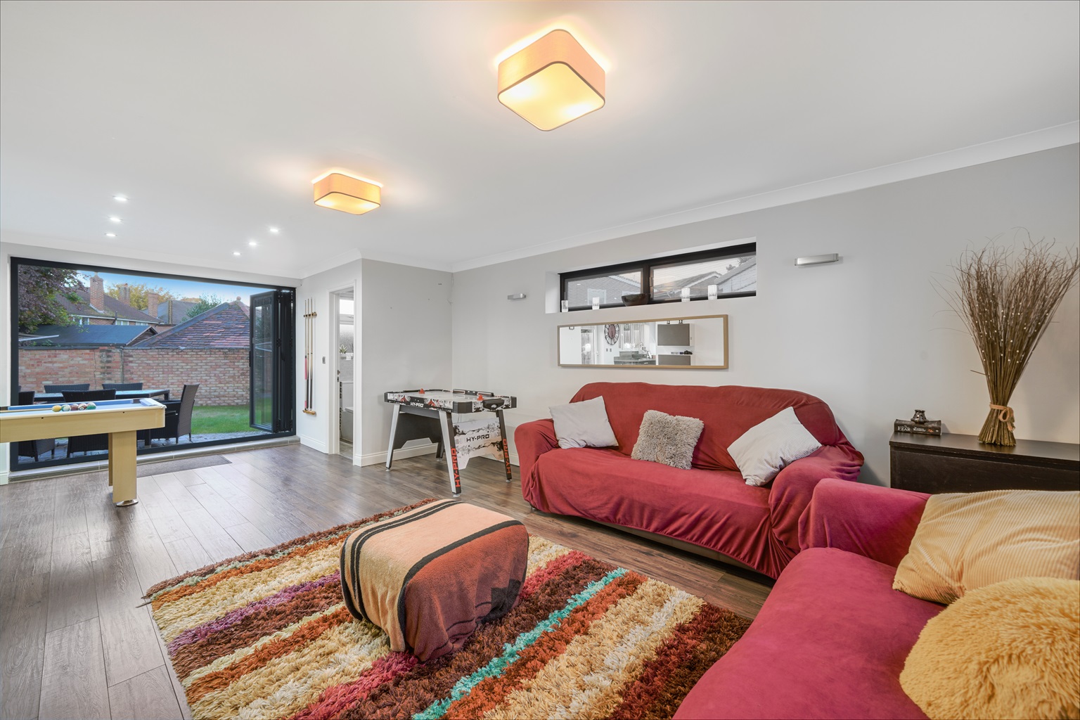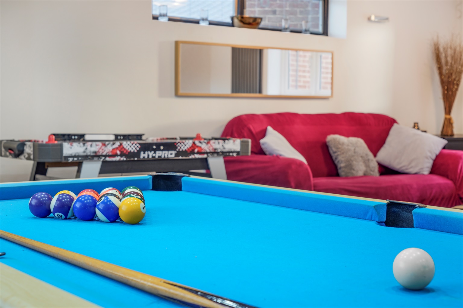 Lounge 2/Games Room: Two large sofas, large TV, pool table, and air hockey table