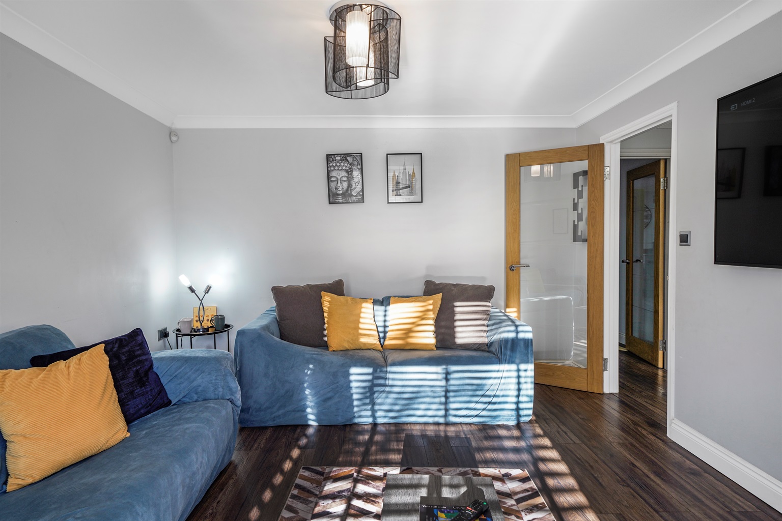 Lounge 1: Two sofas and a large flat-screen TV