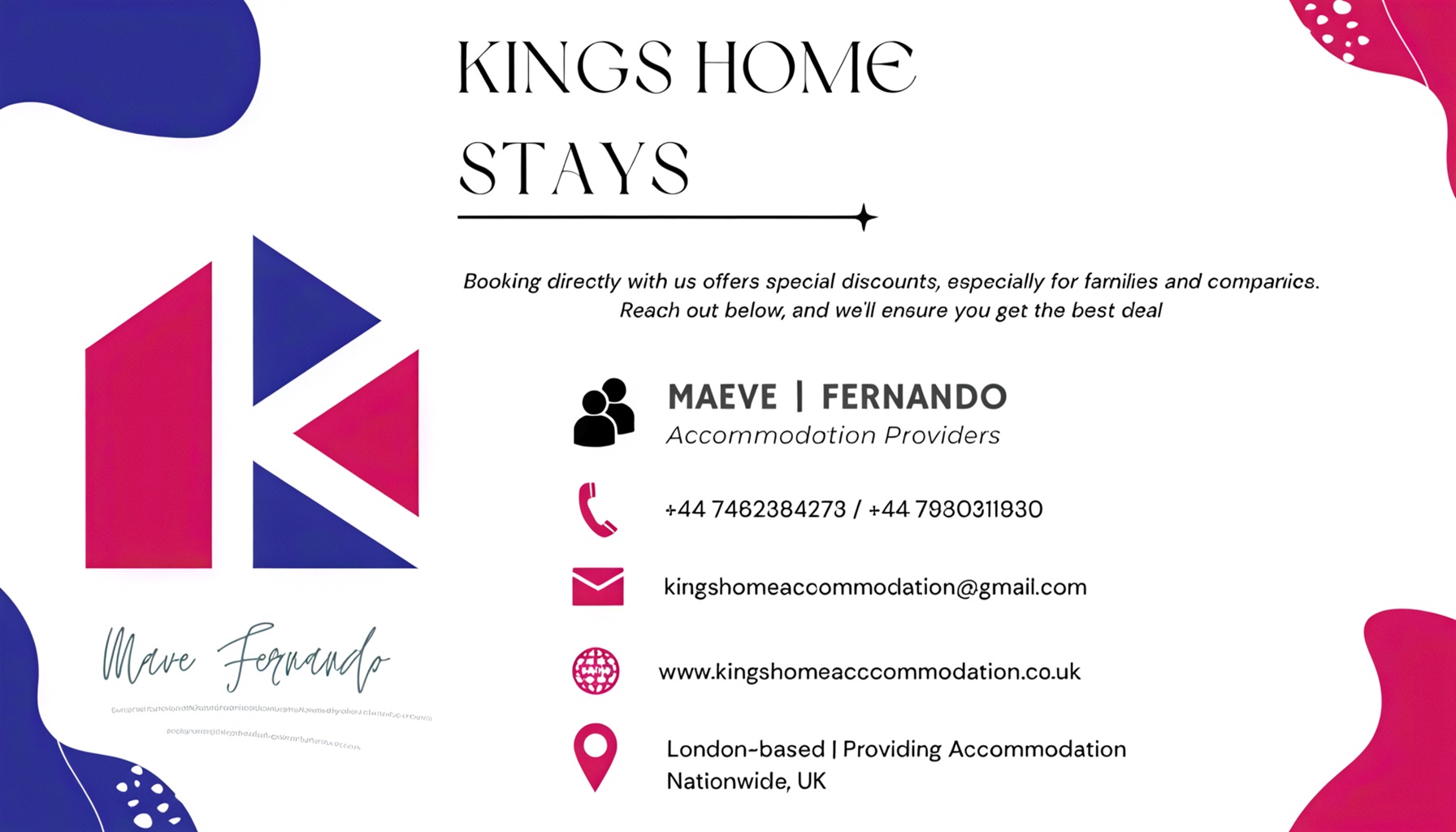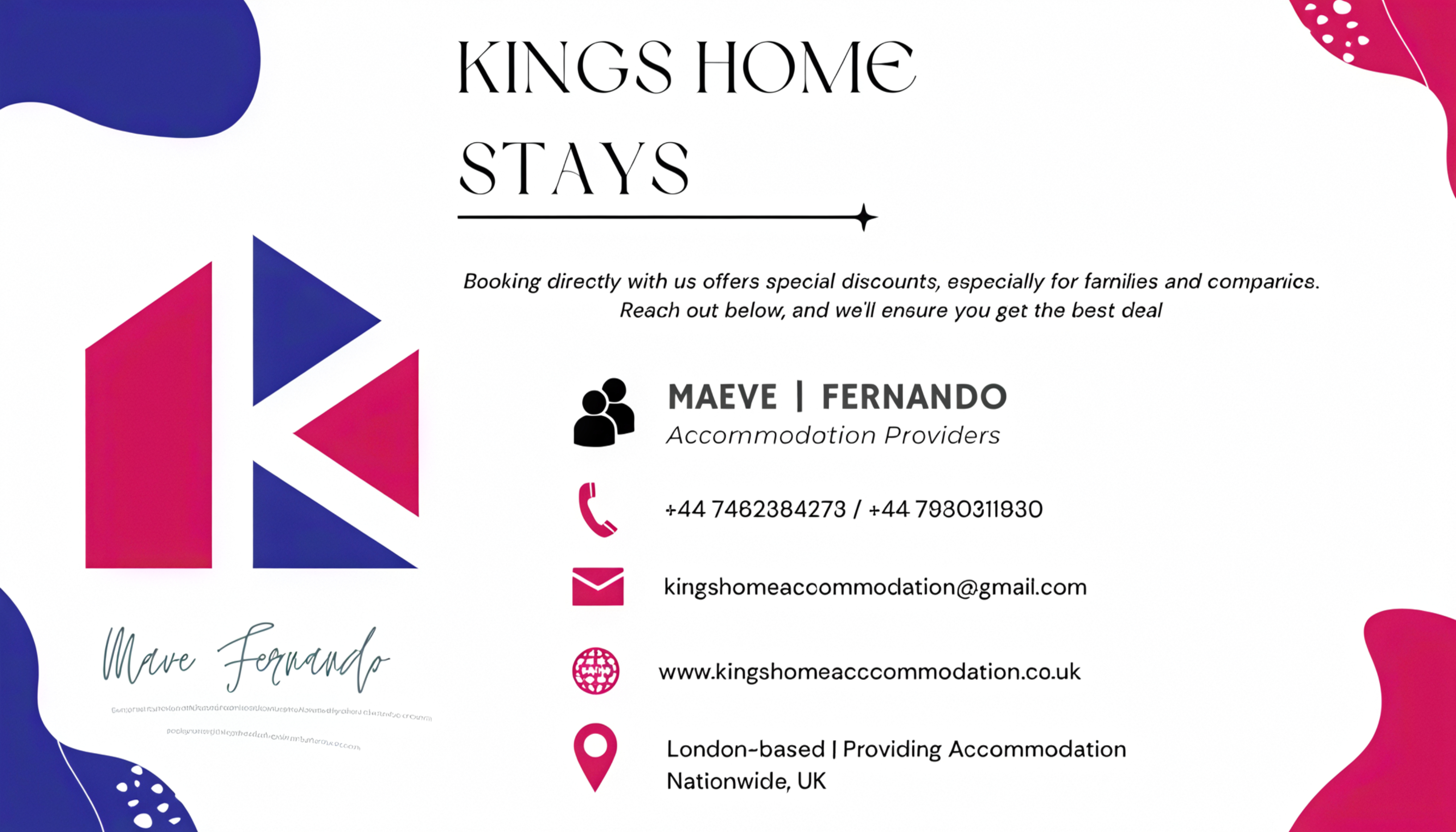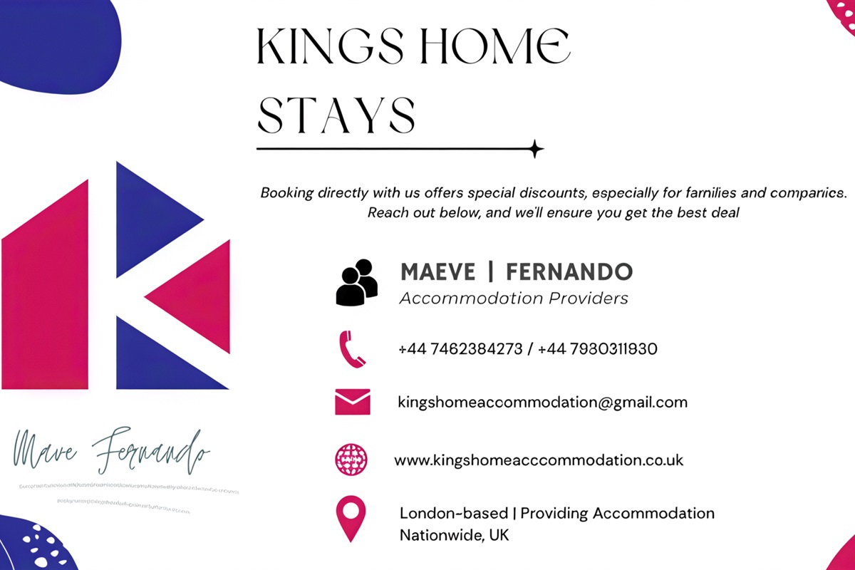 About Us We’re an entrepreneurial couple backed by a specialist operations team. Kings Home Accommodation provides corporate lets and extended-stay serviced apartments that feel like home and run like a hotel. What you can expect Spacious, fully furnished apartments High-speed Wi-Fi and dedicated workspaces Self check-in and 24/7 support Professional housekeeping and maintenance Fully equipped kitchens and quality linens Family-friendly amenities; parking where available Flexible stays from weeks to months Who we host Families planning memorable trips Companies booking short-term or extended stays Domestic and international families relocating Guests between homes or renovating Why choose us Consistent standards across commuter towns and city hubs Transparent communication and responsive service A hands-off experience for bookers and travel managers Ready to book or have questions Use the WhatsApp widget in the bottom-right corner to chat with our team.Location